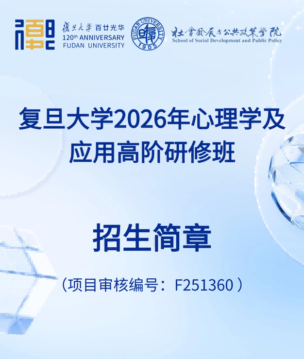 2026年“心理学及应用高阶”研修课程现已启动招生,欢迎社会各界心理学爱好者咨询报名。了解更多项目详情及心理学相关培训信息,请关注“SSDPPLEO”微信公众号,或访问复旦大学社会发展与公共政策学院EDP及培训中心官网:https://www.rcfz.fudan.edu.cn/7241/list.htm,感谢您的关注,期待您的参与。